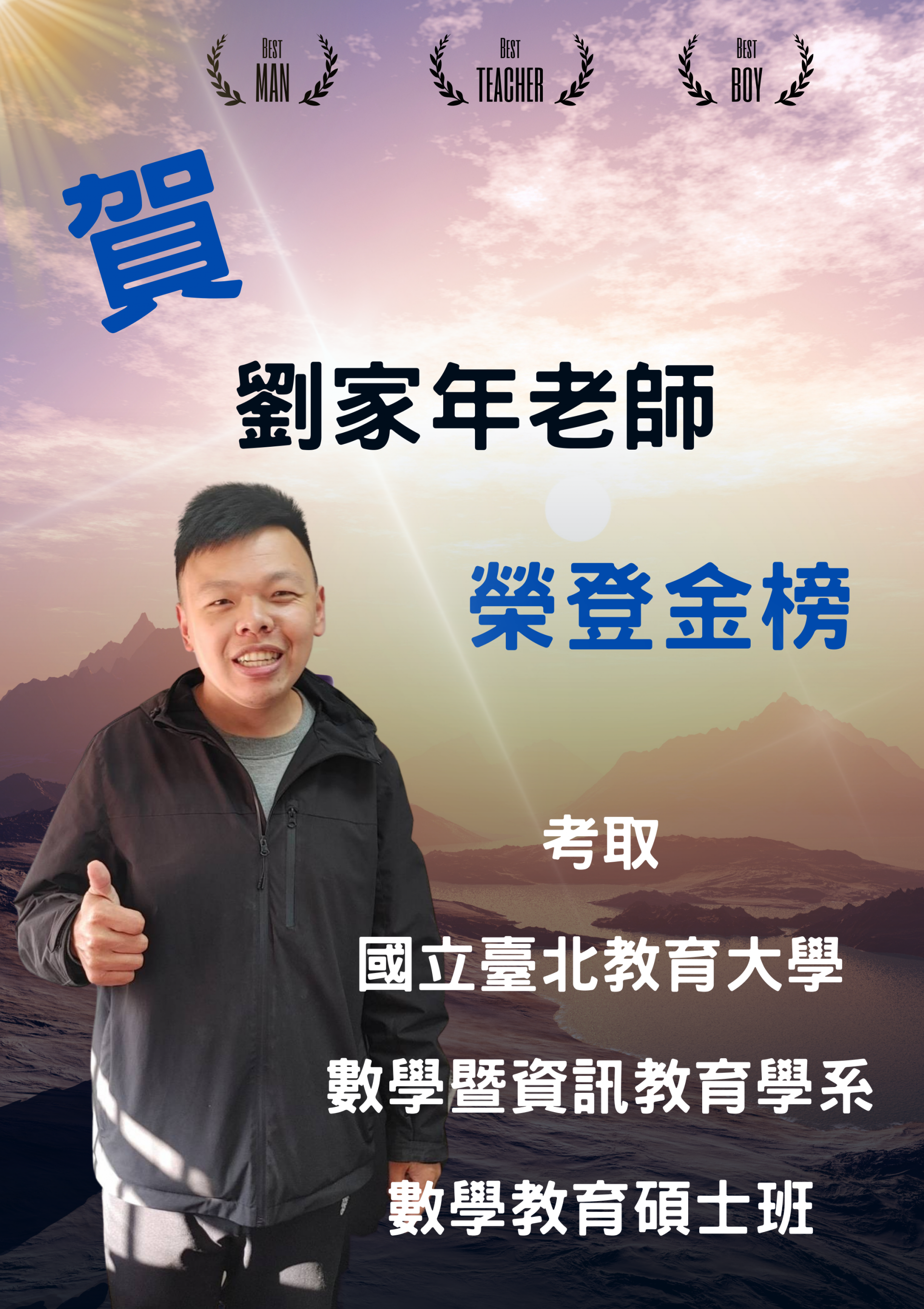 賀 劉家年老師 考取 國立臺北教育大學 數學暨資訊教育學系 數學教育學系碩士班