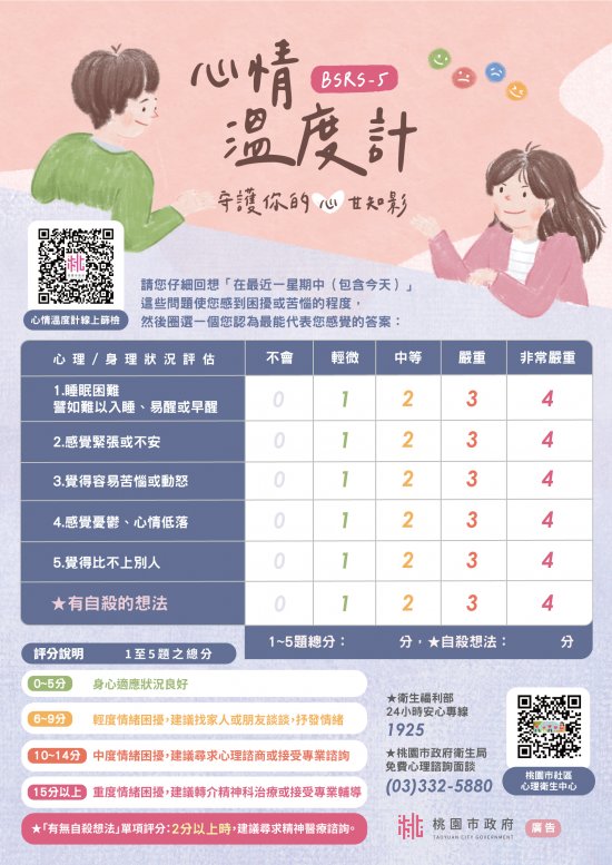 施測結果可供教師或民眾瞭解自己近期的身心狀況, 適時運用心理衛生資源及求助專業協助達轉介標準者(總 分15 分以上或有自殺想法分數2分以上),後續將由本府 衛生局致電關懷,評估是否持續追蹤或轉介相關單位。