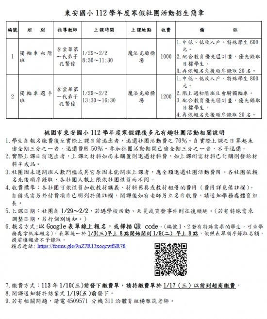 1.寒假社團報名方式統一採「線上表單報名」。 2.表單開啟時間1/3早上8點-1/9早上8點 3. 將於1/10前發下繳費單,請於1/17以前自行於超商繳費